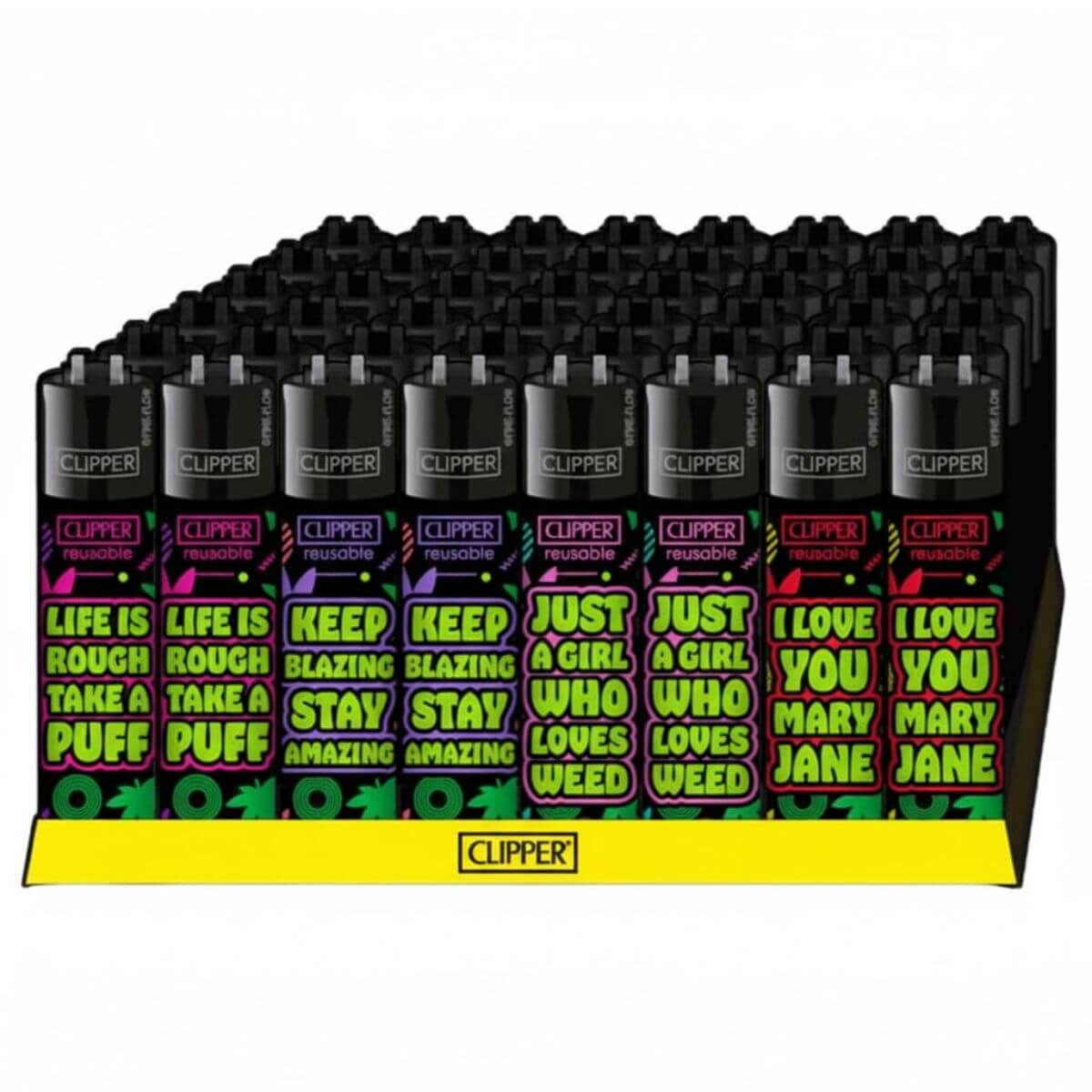 La collection Clipper Lighters Classic Weed Statements #8 (48 pièces/présentoir) allie des slogans audacieux inspirés du cannabis à la technologie éprouvée des briquets rechargeables Clipper. Chaque briquet arbore des couleurs vives et une typographie moderne, parfait pour les consommateurs lifestyle, les collectionneurs et les clients de boutiques de fumeurs. Construit avec un corps en nylon durable, un système de gaz rechargeable et une pierre à briquet remplaçable, ces briquets sont durables, écologiques et idéaux pour l’exposition en magasin. Le présentoir de 48 pièces assure une commercialisation facile et un fort impact visuel pour les ventes impulsives.