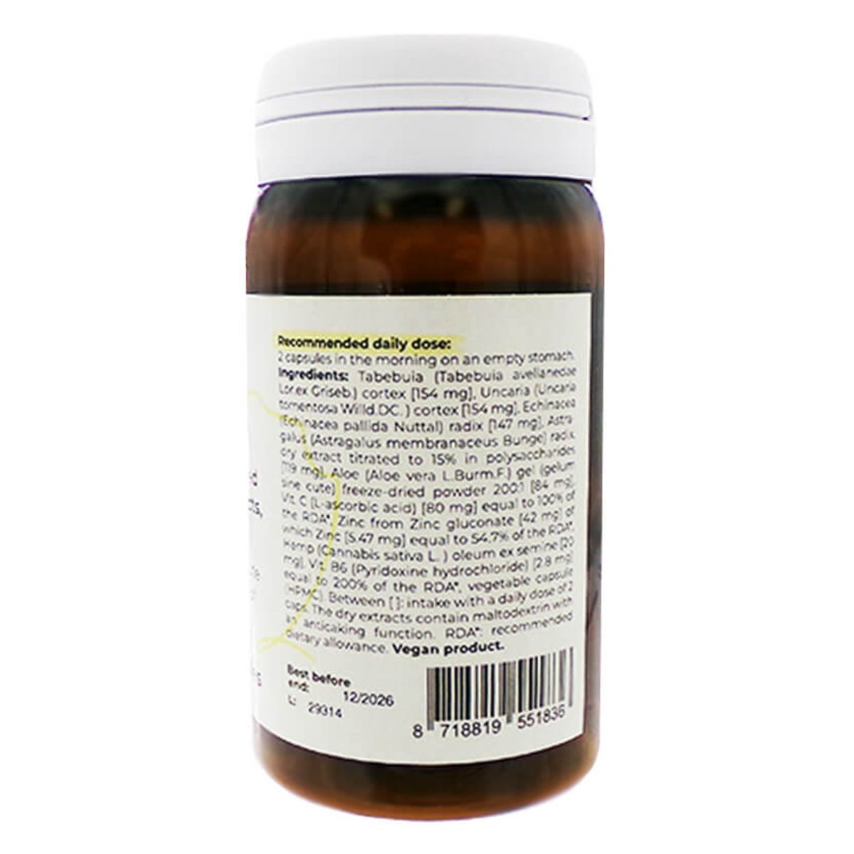 Ingrédients : Tabebuia (Tabebuia avellanedae Lor.ex Griseb.) cortex [154 mg], Echinacea (Echinacea pallida Nuttal) radix [147 mg], Astragalus (Astragalus membranaceus Bunge) radix. Extrait sec titré à 15% en polysaccharides [119 mg], Aloe (Aloe vera L.Burm.F.) gel (gelum sine cute) poudre lyophilisée 200:1 [84 mg], Vit. C (acide L-absorbique) [80 mg] égale à 100% des AJR*, Zinc provenant du gluconate de zinc [42 mg] dont Zinc [5.47 mg] égal à 54,7 % des AJR*, Chanvre (Cannabis sativa L.) oleum ex semine [20 mg], Vit. B6 (Pyridoxine hydrochloride) [2,8 mg] égal à 200 % des AJR*, gélule végétale (HPMC). Les extraits secs contiennent de la maltodextrine à fonction anti-agglomérante. AJR* : apport nutritionnel recommandé. Produit végétalien.